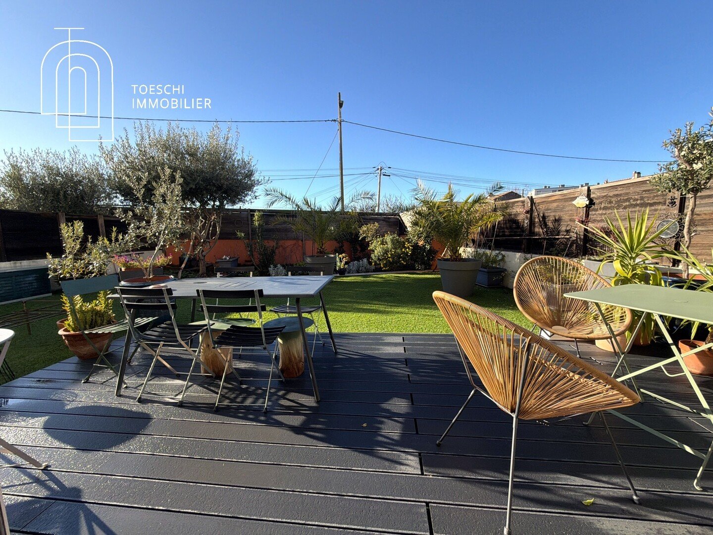 À l’extérieur, une grande terrasse idéale pour recevoir s’ouvre sur un joli jardinet, offrant un cadre verdoyant et intimiste.